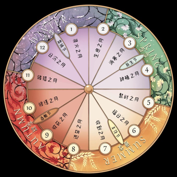 标准的一年有360天,分为十二个二十八天的月(每月四周),还有四个长达六天的节日(需飨节、新生节、丰饶节、酒酿节)。位于仲冬时分的需飨节被认为是一年的伊始,图表中展示出了一年中的月份和节日如何排列。