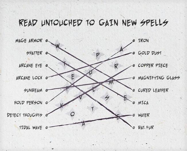 所示,从法术到其匹配的材料成分之间画一条线。当所有法术都被连接到了匹配的材料上时,这些线未触及的字母将拼写出“presto”,而手持这张羊皮纸念出这个词后,一张或多张法术卷轴(或者别的什么宝藏,由你决定)将魔法性的显现出来。