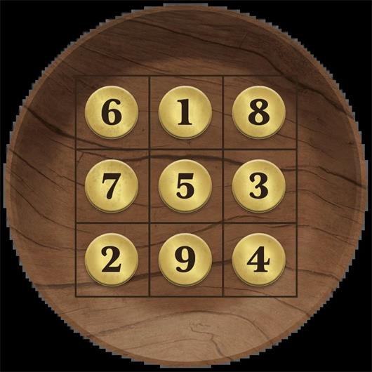 展示了如何划分四十五枚硬币,使每个方格的数量不同,每行每列加起来是十五个。诗句解释说,这扇门需要中心方格所示的硬币数量。插入确切五枚硬币后,锁住的门扉就会开启。